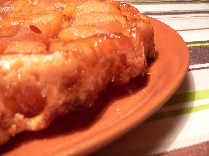 najprej naredi pokrov, torej podn, torej testo: v skledi kar z vilico pretlačevaj (fak, kakšen lingvistični konstrukt, pretlačevaj … je nč, ne morem spremenit, pretlačevaj kar v redu opiše, to kar moraš naredit) maslo in beli skadkor … ko nastane homogena pasta dodaj moko in z vilico (brez šlatanja, prosim!) mešaj toliko časa, da nastane taka drobtinasta masa, s približno enako velikimi ali pač majhnimi grudicami … dodaj čisto malo mleka, recimo za dojenčkov bruhec čajno žličko naj ga bo … z rokami stisni grudice v kepo, če se ne sprime, dodaj še malo mleka, zavij kuglo v folijo in parkiraj v hladilnik za vsak pol ure, raje kar za več … v vmesnem času pa v majhni teflonki na srednjem ognju raztopi rjavi sladkor … ko iz njega nastane lužica, ogenj ugasni in karameli primešaj preostalih 40 g masla, tako da nastane pasta, ki jo kar z žlico namaži po dnu namaščenega modela za pite … olupi in razpečkaj (ta mi je tud všeč beseda) jabolka in jih razreži na 8 kosov, ki jih razporedi po karameli: polovico s krivino navzdol, z drugo polovico pa zapolni luknje med prvopoloženimi (dobro mi gro, tole besedičenje) … zdaj pa kletev na jezik: razvaljaj testo v krog, ki bo malo večji od modela … heha, to je še kr zajeb, no, ampak če daš testo med dva lista folije, mislim, da ne bo prehude frke … testo nato položi prek jabolk, ga ob robovih zatlači proti dnu, prešpikaj z vilicami in zagoni v peč na 180 za ene 45 minut, nakar poglej testo in če se ti zdi, da prenese še malo barve pusti na vročem še kakšnih 10, 15 minut … vzemi ven in pusti par minut, nakar pelji oster nož en krog ali dvaq po obodu pita modela … servirni pladenj povezni na testo in vse skupaj postavi na glavo, se pravi obrni okrog … dvigni pita model in pred tabo bodo lepo zložena, karamelizirana in dišeča jabolka … probaj se zadržat še par minut, vsekakor pa jej in ponudi toplo ta-tinko … ostanke pred serviranjem za kakšnih 10 minut porini v pečico, če jih boš pa tlačil v mikrovele, pa pred tem reci še adijo, hrustljava skorjica …