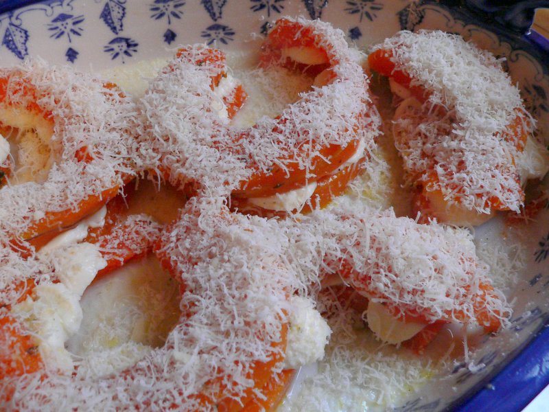 pečico namontiraj na 200, bučo olupi in nareži na centimetrske rezine, posoli, poporaj, potresi s sesekljanim timijanom + žajbljem, zalij z olivcem in zavij v alu folijo, tako da dobiš fleten paket, ki naj se v provoomenjeni pečici dinsta pol ure … vmes nareži mozarello in naribaj parmezan ter naolji nepregorno posodo … in odnesi smeti, pomij posodo od fruštka, izvedi inventuro hladilnika in podobne reči … paket vzemi iz pečice in na dno nepregorke naloži polovico bučnih rezin, vsako rezino pa obloži še z rezinami mozarelle … verjetno ti je jasno, da zdaj čez butneš še drugo polovico rezin, obilno potreseš z naribancem in še za deset minut deneš nazaj na vroče … za zraven bo super pilav (praži čebulo, česen, dodaj enkrat riž in dvakrat vodo, osoli, malo curryja in mlete kumine, kuhaj 10 minut, ugasni ogenj in počakaj, da riž spije župo) … pojej in bodi vesel, ker si za svoje telo naredil nekaj dobrega …
