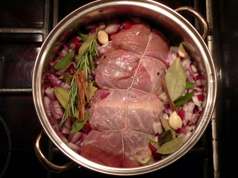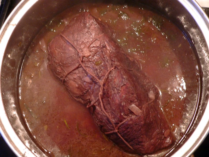 meso je chef prevezal s kuhinjsko vrvico, da je nastal fleten paket, okrog katerega je potem nanizal na kocke narezano zelenjavo in ostale marinadne sestavine … posodo je pokril, jo del na zmerno hladno mesto, si ogledal i kina spiser de hunde in šel spat … dopoldne je iz marinede najprej vzel meso, ga nasolil in napopral potem pa z vseh strani opalil na vročem olivcu in ga dal malo počivat, pač toliko, da je v isti kastroli dobro prepražil še vse namirnice iz marinade … paketek je na tej točki spet zasedel centralno pozicijo v posodi, kamor je pljusknilo tudi marinadno vino … tokom dveinčetrturnega počasnega dušenja je chef meso nekajkrat obrnil, sicer pa so bili to trenutku miru in sprostitve … akcija ob finalizaciji je vključevala odstranitev mesa iz posode in njegovo četrturno počivanje na dilci ter fruliranje (ali pasiranje, recimo) omake, iz katere je chef še pred mletjem pikolovsko odstranil lovorove liste in cimetovo palčko … gladko omako je še malo povrel, da se je zgostila, mesu je odstranil špago, ga narezal na malo manj kot centimetrske šnite in na krožniku prelil z omako … zraven so se jedli široki nudli … in, kot sem že omenil: sonce je sijalo …