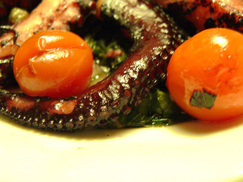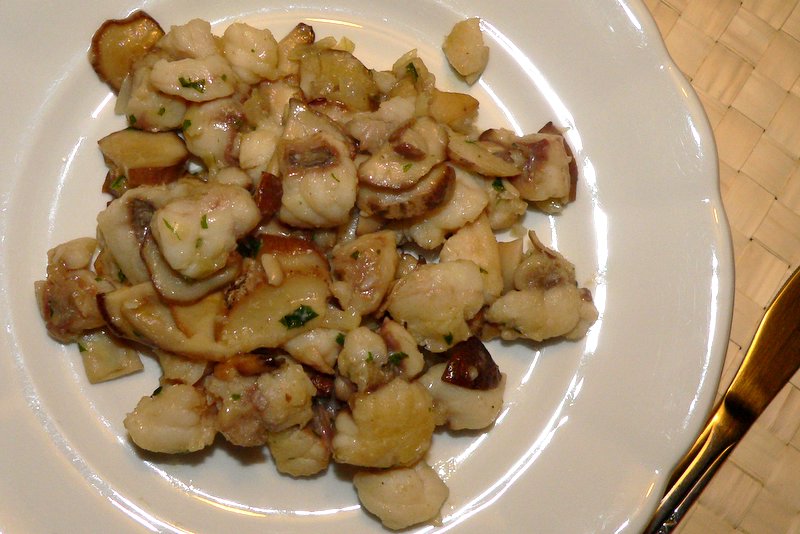 tradicionalno krščansko petkovo kosilo: riba … in to žaba z jurčki, hehe!chefica se je sredi prejšnjega tedna odločila, da mlekarstvo in krmljenje zgolj najmlajšega kosa rodbine nista dovolj in da je nujno treba obnoviti vzdevek, ki se je drži na tejle strani … chef in minichef sta se tako pretvorila v pitanca, ki ju je v petek pričakal dišeč rep morske žabe z jurčki, v soboto sta, eden hitreje, drugi pa po manjši pavzi, pomlatila sočnega zajca v pomarančni omaki s kostanji, za veliki vikend finale pa je iz pečice na plano zlezla hobotnicahobotnica, blitva in češnjevčki iz pečice … prav nam je! in se zleknila na blitvo, naravnost med češnjevčke … chef resno razmišlja, da bi tudi v sicer prijetno in uravnetoženo okolje domače hiše impliciral tradicionalno slovensko metodo priklepanja babe k šporhertu … samo kaj, ko nima verige, ki bi bila dovolj dolga, da bi nesla tudi do likalne mize … skratka, dragi bralec: chefica je (za razliko od barcelone) v vrhunski formi!