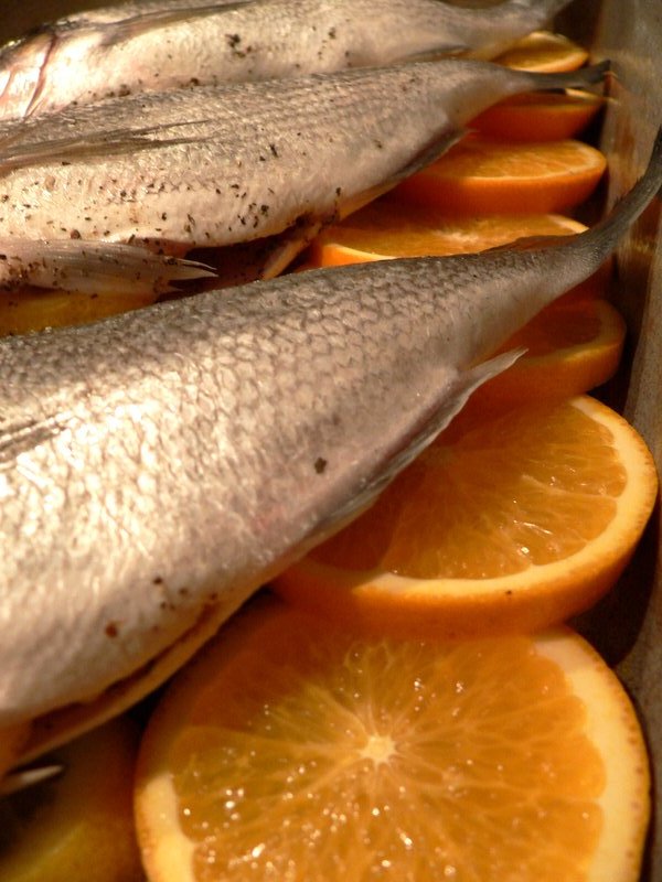 trebuhe oluskanih, očiščenih, opranih in osušenih rib posoli, popopraj in provansaliziraj … pomaranče nareži na rezine in v vsak ribji trebuh deni po eno, ostale pa polagaj na dno naoljenega pekača … vrh njih položi orade, jih še narahlo posoli, premaži z olivcem in okoli njih razporedi na tanke rezine narezano zelenjavo … pekač pokrij z alu folijo in ga za pol ure parkiraj v vročo (220 stopinj) pečico … medtem pripravi idealnega partnerja: pire krompir … čez pol ure odkrij folijo, ribe, pomaranče in zelenjavo prestavi na krožnike, pire pa prelij s sokom, ki se je natekel na dno pekača … mmm, diši! … chef je zraven pil polsuhi renski rizling 2004 iz jeruzalema, ki ga robert gorjak proglaša za najboljše vino na svetu za dva evra … se mi zdi, da ima kar prav …