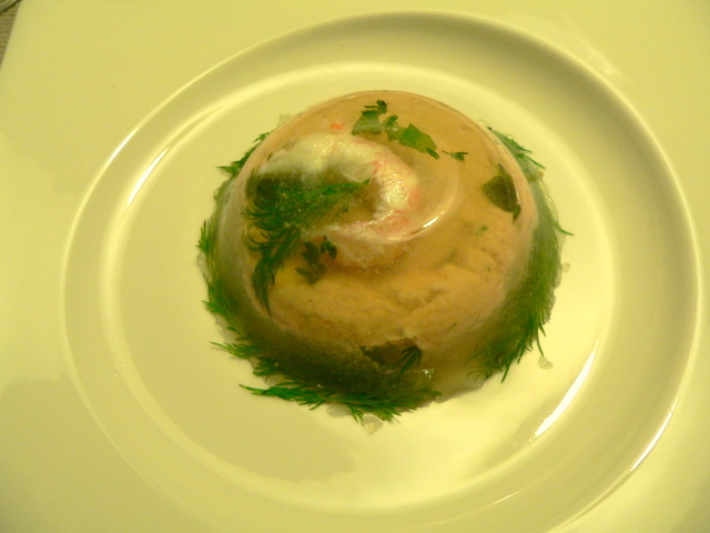 v pol litra vode potopi lovor, peteršilj, por, pol pehtrana, nekaj koromača, poprova zrna in  šestcentimetrski ostružek limonine lupine in pristavi na ogenj … pusti vreti par minut, nakar zbrani dišeči druščini dodaj še škampe in lososa (slednjega brez kože), pokrij, še enkrat zavri, ugasni ogenj in pusti pokrito stati deset minut … škampom odtrgaj glave(ali repe) in repe olupi: štiri daj na stran, štiri pa skupaj z lososom, maslom, soljo in poprom zmelji v fino paštetko, ki jo parkiraj v hladilnik … vodo (ki je zdaj v bistvu že juha) precedi skozi fino gazo in vanjo zamešaj v hladni vodi zmehčane in ožete lističe želatine … če boš individualiziral, vzemi štiri okroglaste skledice in na dno vsake položi škampov repek in malo sesekljanega pehtrana … prelij z malo želatinirane juhe in ohladi, da se želatina strdi … na to strjeno bazo naloži lososovo pašteto in okrog nje nanizaj koromačevo perje, ter spet zalij z želatinirano juho … še enkrat ohladi in nato zvrni na krožnik ter postreži s towstom in kakšnim finim chardonnayem ali suho penino …