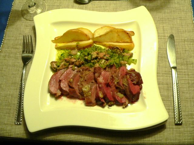 fileja položi v pekač s kožo navzdol, ju prelij (no ja, premaži) z na tanke kolobarje narezano in na hitro sotirano šalotko ter jih butni v pečico za dvajset minut … deset minut kasneje začni v ponvi na maslu peči neolupljene na šestinke narezane hruške … v drugi ponvi pa najprej praži na drobno nakockano steblo zelene, dodaj na malo večje kocke narezana gosja jetra in vse skupaj praži še dve (več pa res ne, drugače se bodo jetra stopila) minuti … prsa vzemi iz pečice in nareži ter nato vse troje po lastnem umetniškem navdihu zloži na krožnik … midva sva za zraven planila po šekoranjevem gamayu 2000, ki je bil sicer fleten, ampak ne tako presenetljivo saden in dišeč kot 1997 …