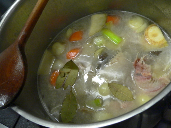 zelenjavo nareži na enakomerno velike kose in jo na izi praži na olju … dodaj kosti (in če si filiral sam tudi kože in glave) še malo porari in najprej zalij z belim vinom, ko se to razdiši pa še z vodo, tako da prekrije zenejavo in kosti … dodaj še lovor in pusti vreti nič več kot dve, tri minute … (ta podatek me je precej presenetil, ker sem živel v prepričanju, da dlje kot pališ boljše je … ampak pri ribi ni tako, ker gre menda že s prvim vretjem ven iz kosti vse, kar naj bi šlo in da od tu naprej nimaš več kaj praskat, lahko si kvečjemu kakšno grenčino v fond pridelaš – in grenčino imamo raje v obliki pelinkovčka, kot pa v fontu) … odcediš in uporabiš ali pa ohladiš, zamrzneš in uporabiš …