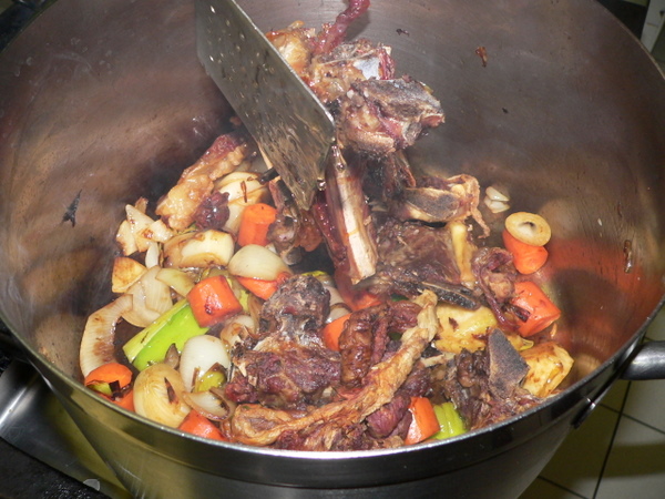 še vina, lovora, popra, vode in par parov ur mi dajte, pa bom …telečje kosti daj najprej v pekač, potem pa v ful razgreto pečico za dvajset minut … medtem lahko začneš pražit zelenjavo – na olivnem olju jo zabrnaj kar na zlato rjavo barvo, dodaj pečene kosti in praži dalje … zalij z rdečim vinom, dodaj poprova zrna, lovor in vodo, ki bo vse pokrila ter začni kuhat … kuhaj na veselem plamenu … vsaj tri ure, lahko pa tudi štiri ali pet … precedi in se potem odloči ali ga boš porabil takoj, ali ga boš še reduciral … če se odločiš za drugo opcijo, ga daj v kastrolo in na malem ognju pokuhavaj deset ali dvanajst ur, ali pa toliko časa, da prideš na 15 do 20% začetnega volumna … ko boš dal to čobodro v hladilnik bo skočila skup in je boš potem omakam dodajal čisto malo … okusa bo pa ful! … eric pa iz svojih vajeniških cajtov zna povedati tudi anekdote o perpetuum fondu – takem, ki je v krčmi na ognju brbotal po deset dni skupaj, medtem pa so ga dofilavali z obrezki zelenjave, kosti … ultimativna čobodra, bi rekel …