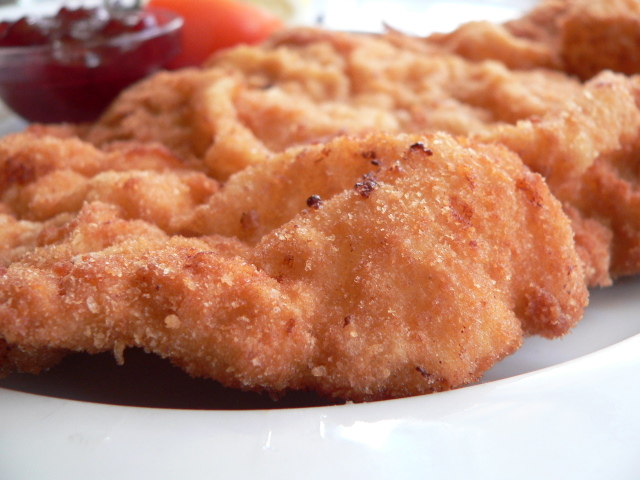 2. wiener schnitzel v taisti krčmi je pa v bistvu winner … svinjski, lih prav velik, da te ne zademfa do konca in mehak, tako da se ga, kot bi rekla arkova, preverjeno! da lahkotno razkosavati z vilico … zraven poleg obvezne fete limone, šnite paradajza in pildka solate postrežejo ne presladko brusnično marmelado in malo presladko krompirjevo solato … hvalimo še leberknoedelsuppe in sladek knoedel s toplo marelično marmelado, zamorčku pa oblačijo srajčko iz kiselkaste smetane …