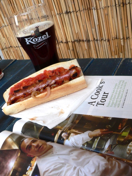 pričujoče spletišče ostaja v znamenju hodokov, konkretneje tale zapis opozarja, da v lepi žogi (ki pri chefu ni priljubljena zgolj zaradi televizičnega prenašanja vseh sort športnarij, ampak predvsem zaradi ekskluzivne (seveda v tistem pomenu tega označevalca, ki razlaga, da takšne ponudbe po mojem vedenju ni moč zaslediti nikjer drugje v domovini) prakse točenja černeho velkopopovickeho kozla v primerjavi s katerim se njegov slovenski soimenjak pije kot zgolj preveč prepražena z mehurčki in preveč alkohola opremljena sladna kavovina) vsako sredo pripravljajo super fine hodoke … fedr po dolžini prerezano štručko in po diagonali zarezano hrenovko hrustljavo nagrilla, nabor dodatkov pa poleg običajne zenf-majo-kečap-iwar (ki jih šef na konkretni lokacijo gladko zanemari) vsebuje krasno, fletno začinjeno paradižnikovo salso in nemastno, do rjavega spraženo čebulo … seveda me po prvem pojedenem prime, da bi še, ampak dimezija je vendarle takšna, da jih tudi kostanjškov jožko nikakor ne bi zmazal 66, vsaj ne v dvanajstih minutah …
