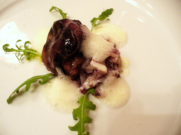 še vedno hladna: leva reč je listnata solata s pinjolami, nanizana okoli terine iz črnih trobent, ki so precej aromatične, simpatične in v oštarijah zelo redko videne glive … naokrog so premeteno dozirane še kapljice in vijuge raznih svežih pomad, s katerimi se potem človek igra in vsakemu grižljaju daje drugačen pečat … desna reč je hladna hobotnica s krompirjem, prelita z se-mi-zdi-da-paradižnikovo peno (kapučinske pene ima jb trenutno zelo rad, za pozdrav iz kuhinje je na mizo poslal cocktail kozarec, napolnjen z dišečo koromačevo), za ostrino in presek pa je zraven še ravno prava doza pikantne rukole …
