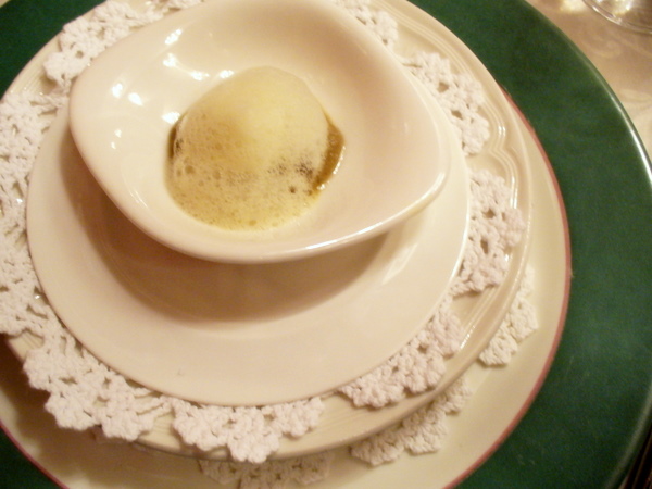 zdaj sva že dobro ogreta, temperatura pa še narašča: joint špagetov s parmezanom je podložen z zeleno kremo, iz katere je dišalo po špargljih in nadložen z dišečimi slanimi ikrami, bojda iz irana … ostriga na desni je termično obdelana, podložena z artičoko in nadložena z olivno peno … je pa res, da mogoče ni bilo čisto tako, ker je bilo teh pen res veliko, zapiskov pa nisva delala, ker sva feštala in zdaj tole rekonstruiram po fotkah …