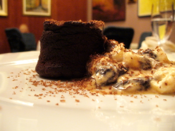 za konec sva planila še po sladkem: nadstropne panakote, pri kateri so se med smetano vrivale plasti rabarbarine kreme, se skorajda nisva upala razkosati … da sva jo vseeno uničila sta krivi pehtranova in še-ena-dišeča omaka (note to self: pametni pišejo, cepec!) … čokoladni fondant s kremiranimi slivami ob strani je pa prav tako najprej generiral sline, potem pa še mlaskanje …