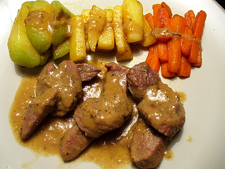 zrezke osuši in nareži na približno dva centimetra široke trakove … vsak trak zvozlaj v ličen vozel, posoli, popopraj in čisto narahlo potresi z moko … pripali ponev z olivcem in vozle z vseh strani coppertoniziraj (da pocrnite, a ne izgorite) … skratka, rjavi naj bodo … za moment jih vzemi iz ponve v katero prilj vodo in dodaj malo med dlanmi sprašenega timijana … postrgaj in razmešaj, vse, kar se je bilo prilepilo na dno in ob rob ponve ter zavri … zrezke nazaj, pod pokrov in pokuhavat 20 minut … na koncu vmešaj še gorčico, ugasni ogenj in omako emulzificiraj (uf, mnogo sam pametan, umem strane reči!) s koščkom hladnega masla …
