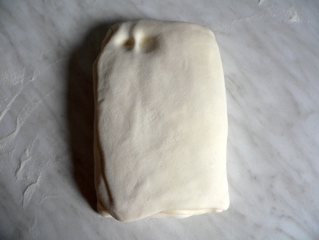 testo rahlo pomokaj, spravi v vrečo in za pol ure parkiraj v hladilnik … potem ponovi proceduro: valjanje, zlaganje, obrat 90°, valjanje, zlaganje … to ponoviš trikrat, vsakič vtisneš dva prsta več … ko bi bilo prstov osem, jih ne vtisneš, ampak nehaš … puff daddy pastry je pri koncu! … razvaljaj ga, kot zahteva recept, ali pa ga nareži pa tretjinke in zamrzni … cool, je taku?