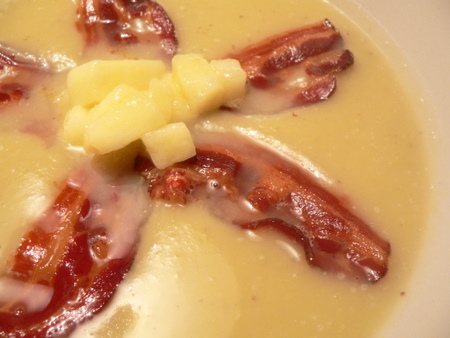 v kastroli raztopimo maslo in nanj liframo nakockano zeleno in krompir, narezan por ter sesekljano čebulo in česen … nežno pražimo 10 minut, da se zelenjava začne mehčati … prilijemo osnovo, dodamo lovor, zavremo in pustimo brbotati 20 minut, oziroma, dokler zelena ni čisto mehka … župo ožemetnimo s paličnim, solpopramo, prilijemo še sladke smetane in še malo povremo, dokler ne pripravimo hrustljavih dodatkov: jabolka na kocke in na hitro sotiramo na maslu, slanino pa v neoprijemljivki počasi razmaščujemo do hrustljavosti – na koncu mora hrskat kot kreker, bodimo potrpežljivi in je ne nažigajmo z visoko temperaturo … pojemo vsi skupaj!
