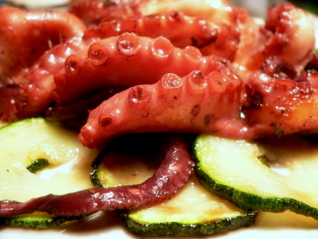 ko je bil chef kakšnih petnajst let mlajši, približno petnajst kil lažji in je imel na glavi petnajst las več kot zdaj, je rad zašibal tja dol v dalmatinsko krajino, na brač, konkretneje u selo bobovišća na moru, kjer se je pri tonkotu nazorju, sicer nečaku vladimirjevem, utaboril v podstrešni sobici in dneve preživljal v senci s flašo kaltenberga v roki, večere na terasi pijoč tipično trpko/kislo domačo bevando in mlaskajoč ob krožnikih iz kuhinje tonkotove žene fanice, noči pa na tonkotovem s plinsko lučjo, pomočnikom dejanom in štirimetrskimi ostmi opremljenem čolnu … z motorčkom smo najprej v temi drobencljali kakšno uro daleč, potem pa na vesla in s prižgano lampo počasi iz uvale v uvalo … in vsake toliko je tonko zadegal ost v vodo in iz nje izvlekel hobotnico … potem jo je zelo nazorno pokončal s krepelcem in spravil v vedro … in tako naprej, do treh, štirih ponoči … pa spet uro drobencljanja nazaj domov … precej divje in prvinsko je bilo vse skupaj, prav zato me je verjetno tako fasciniralo, da sem rinil z njim vsako noč … enkrat se je na bodicah osti zvijalo nenormalno veliko število lovk – aaaa! vidi je, ona ždera muzgavca … e, nečeš! in ji ga je lepo spulil iz ust ter kresnil vsakega posebej … preden sta končala v vedru sem bil deležen še lekcije kaj je muzgavac: muškatna hobotnica, manjša kot ta velike in s samo eno vrsto polipov na lovki … zadnjič je imel ata privileggio na zalogi fletne primerke, tretjino kile je meril vsak in trije izmed njih so končali takole: