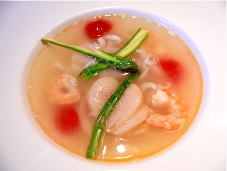 odkar je v javnost hušknila aferica mccainove predsedniške kampanje, ki je na svojo spletno stran po liniji kopipejstala nekaj receptov iz food networka in jih potencialnim volivcem predstavila kot recepte kandidatove soproge, gospe connie, sem malo več premišljeval (in s chefico, s katero sva glede tega še vedno na rahlo nasprotnih bregovih, klepetal) o avtorstvu v kuhariji in pri objavljanju receptov … ko enkrat zavrtaš v ta issue, se ti začne odpirati morje vprašanj in dilem … recimo: do recepta za kremasto polento s šparglji je prišlo tako, da je sodesetkar urban jedel polento pri petru patajcu, ki mu je povedal, da polento zato, da postane bolj kremasta, zmelje s paličnim mešalnikom; urban je potem na snemanju pilota za desetko tehnični patajčevi finti dodal to, da je polento pred mletjem kuhal v sladki smetani; jaz pa sem potem dodal še celoten špargljasti del … kdo je zdaj avtor tega recepta? … vsi trije? … samo prvi, iz katerega osnovne ideje so nastajale variacije? … samo tretji, ker sem ga edini zapisal? … ali je dovolj, da pri izrazito avtorskih receptih kakšnega kuharskega velemojstra spremeniš sestavino ali dve in se potem pod to podpišeš? … ali je to, da skuhaš natančno po vendelininem receptu in opišeš (recimo na blogu), kako si to počel, kršenje njenih avtorskih pravic? … in kdo je originalni avtor recepta za panakoto in saltimboko? enoznačnih odgovorv v resnici ni … recepte si ljudje p(r)odajamo že stoletja in verjetno si jih bomo še naprej … ko pojem nakaj dobrega, ko vidim fotko zanimive jedi, ko slišim ime jedi, ki me pritegne, si želim to skuhati … in mislim, da ko enkrat jed skuham na svojem štedilniku je v njem tudi nekaj mojega, torej je to tudi moj recept … kuharijo bi zato lahko opisal kot večtisočletni neprekinjeni konsenzualni creative commons … ampak ko sem že pri creative commons: katero licenco naj izberem, da bi z njo zaščitil svoj blog, če pa že osnovna predvideva najmanj priznanje avtorstva … pa sem spet tako rekoč na začetku: ali sem sploh avtor? … no, kakorkoli, mozganje o tem me je zlakotnilo, tebe pa verjetno tudi, zato urno priobčujem en recept … osnovno idejo je prispevala ana roš, ko naju je pred kakšnim mesecem oborila s nogu (poročilo o tem še pride), sam pa sem recept še malo porihtal po svoje … dajmo rečt, da je to tako, kot da bi naredil remiks zelo dobrega komada, super simpl morske juhe … najprej fotka originala: