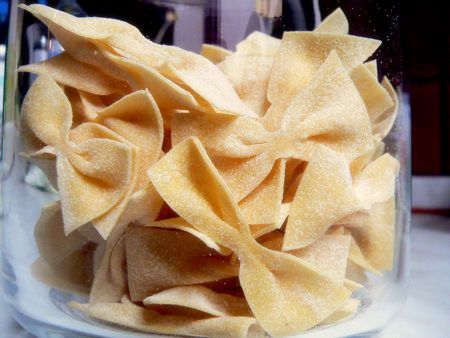 zaključni del sage o lazanji govori, ne boste verjeli, o insektih … natančneje o lepidopterah, po domače metuljih … pa za to ni treba plesti mreže, se pojati za citrončki po travnikih, niti se matrati z metuljčkasto plavalno tehniko ali zavezovanjem leptirčka okoli vratu … kaj šele, da bi si kakšnega očarljivega pisanokrilca še prhutavega vtaknili med zobe … nak, nič od tega … dovolj bo, da otožne obrezke testa, ki se ne uvrstijo med lepe in simetrične lazanjotvorne pravokotnike, razrežeš na male pravokotničke (15 x 30 mm), ki jih s palcem in kazalcem na sredini stisneš, odložiš na peki papir, počakaš da se dobro posušijo in jih zapreš v dobro zaprto posodo: