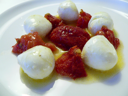 ko je lani poleti v hišo prispela donirana gajbica vrhunskih domačih paradajzov, se je, kot se bo mogoče še kdo spomnil, chef nemudoma lotil vkuhavanja in zamrzovanja paradižnikove salse, ki nam je potem vmešana v bolonjske omake in ostale pašte in rižote na rdeče, namazana na pizze, dodana pečenim piščančjim kosom i-te-de osončevala zimske mesece in krajšala čas do naslednje paradajzaste sezone … v kateri smo – iz takšnih in drugačnih razlogov – pozabili na nakup ekstra dišečih paradajzov, ko je zato še bil čas in tako smo zdaj, ko je prvi sneg že odnesel šalo, popolnoma brez zalog chefu tako ljubega pomidorja … oziroma, bi bili popolnoma brez, ko ne bi on dan pri eni od svojih dveh branjevk (ne povem kateri, da mi jutri kdo ne spelje še preostalih paradajzkov, kajti kar sledi, bo šlo še v repete) zagledal majhno zalogo še relativno okej ljubljanskih rastlinjaških rdečkarjev … okej, to niso tisti avgustovski ali septembrski naparfumiranci, ampak za nameravna metodo konzerviranja so bili še zmeraj več kot dovolj dobri … bottom line celotne procedure, ki jo v svoji knjigi think like a chef (ne, ni o meni, hehe) popisuje tom colicchio, je, da okus paradižnika skoncentriraš s pečenjem na relativno nizki temperaturi, in jih tako delno izsusiš, a ne do tiste žvečljive pomodoro secco faze, pri kateri ostane večinoma lupina in nekaj na njo prilepljenega mesa in pri kateri je pred uporabo neizogiben proces rehidracije … da ti bo bolj jasno, prilagam dve sliki … takle je protfan, preden gre v pečico: