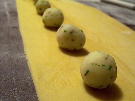 to bo sicer trajalo, ampak kar porabi celo maso, ker je tole treba delat sistematizirano, po etapah, drugač je potem cela štala … ko so kuglice navaljane, odreži približno četrtino testa in ga spusti skozi mašinco … ni ga treba razvaljat preveč na tanko, jaz sem se ustavil pri številki sedem (od devet) … trak razvaljanega testa položi na pomokan pult, polovico (glej sliko!) premaži s stepenim jajcem in nanj polagaj kroglice nadeva: