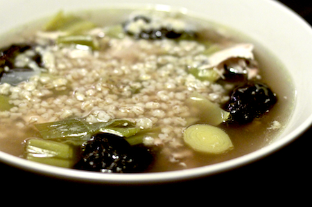 če boš uplenil domačega piščanca, je možno, da se ti bo skupaj z njim porodil strah pred premastno župco … znebiš se ga preprosto piščetu olupi kožo in obreži odvečno maščobo ter zrenderiraj kurje ocvirke … pišče operi, ga daj v pisker, prelij z vodo in pristavi na ogenj … dodaj sol, poper in lovor ter pusti počasi vreti uro in pol … poru poreži štrleče zelenje, dobro operi in nareži na dvocentimetrske kolobarje … stresi v juho in kuhaj še četrt ure … odstrani pišče, poberi meso s kosti, ga natrgaj na grižljaje in vrni v župo … in to je to … z opcijama postopaš tako, da iz ta velkega piskra odliješ malo juhe v dva lončka: v enem naj četrt ure brbotajo slive, v drugem pa tričetrt ješprenčki …