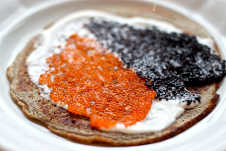če redno spremljaš kruh pa vin, boš vedel, da sta zadnja dva pribeležena dedotova štedilniška poduhvata zajemala iz ruske in švedske tradicije … no, tovrstno oziranje na sever in na vzhod pa se je očitno prijelo tudi naslednje generacije naše razširjene familije, saj še veš, kakšno navdušenje nad finsko košto sta širila kruhinvino … ne vaš pa, da smo oni dan izvedli še ektenzijo na vzhod … že kakšno leto sta se v hladilniku valjala dva teglčka: eden je v sebi nosil oranžne, drugi črne kroglice, oba pa sta bila pokrita z modrim pokrovčkom na katerem je z velikimi belimi črkami sijalo ime največje švedske pop atrakcije vseh časov … pa se je izkazalo, da anni-frid, björn, benny in agnetha z ribjimi konzervami (ki jih je moč kupiti na izhodu iz rumenomodrega globalnega opremljevalca prostorov) nimajo skupnega nič drugega kot ime in državljanstvo … no, tile švenski kao-kavijarji seveda niso tista prava stvar, ampak priznati moraš, da na s kislo smetano premazanih blinih, ruskih debelih ajdovih palačinkah, izgledajo prav bling-bling: