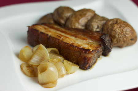 kompletiranje: na vsak krožnik daj kvader hrustljavo zapečenega pujsa, dodaj krompirjeve lupine in odcejene, na hitro segrete čebulice … mmmmm, nordic!