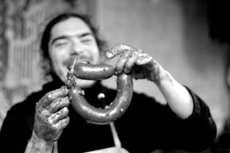 marij, slavčev jagr in mesarski guru je nastopal v vlogi modre čelade in lepo balansiral tenzije, ki so pojavljale ob konceptualnih pokrajinskih trkih … primorska divizija (tokrat sta jo predstavljala izjemna zamejska vinarja dario prinčič in franco terpin), je bila tu zato, da pobere noge in flame in jih doma pretvori v salame in pancete, barve osrednjeslovenskega bazena pa je branil lojze škoda, ki je sprva predvsem zavijal z očmi in z globokimi vzdihi ter z odmahovanjem rok izražal globoko skepso tako nad primorskim stilom razkosavanja sv. kadavra, kot nad po skaručensko divjim dodajanjem popra in majarona v maso za krvavice … ampak, ko je bilo treba taisto maso stisniti v črevo in ga zašpiliti v klobase, je z izjemno rutinersko spretnostjo zasijal v vsem siju obvladaškega mesarja … ostali smo bili bolj opazovalci, kibici in jedci nenadkriljivih s. sv. sv. jetrc (s. sv. sv. stoji za super svežih svinjskih) s čebulo, je pa res, da smo s sabo odnesli tudi marsikatero tajno velikih mesarskih mojtrov … nekaj prizorov celodnevnega dogodka sem ujel v svoj objektiv in te vabim, da se skoz motive preklikaš tukaj … sicer v disclaimer ne morem zapisati no animals were harmed during making of this photos, ampak that’s the way the story goes na kolinah …