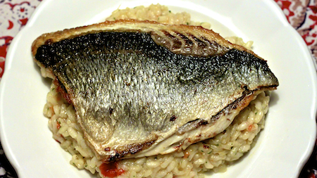 na olivcu prepraženo čebulo in riž zalij s suhim belim in začni po zajemalkah prilivat fond iz kosti in glave sfiletirane orade, korenja, koromača, pora, lovora, peteršilja in belega popra … ko je rižota skoraj že, vmešaj par narezanih ozimniških paradjazov, sesekljan peteršilj in žlico, dve baziličnega olivca in pokrij … z ribo pa idi na precej vroč naoljen teflon: štiri minute po koži, zmanjšat vročino in nato še par minut po ne-koži …