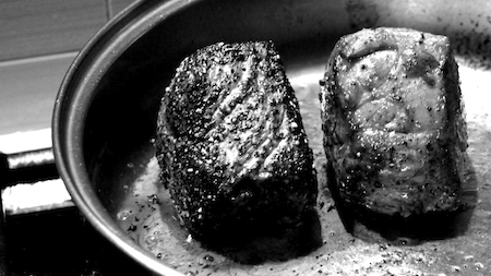 v žlici grobo strtega črnega popra in žlički soli povaljan počez (in ne podolžno!) na pol prerezan polkilski kos uležanega roastbifa … vroča (ne razbeljena!) ponev s putrom in oljem …po tri minute na vsaki od ta velikih stranic in po minuto, minuto in pol na stranskih za medium rare … nato meso, zavito v alu folijo, počiva, ponev pa popeče na pol prerezano glavo treviškega radiča … še kocka ali dve gorgonzole… pa stejka na taljato … pa glaž rdečega … pa še enega … pa ven!