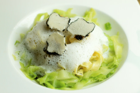v segret globok krožnik najprej deni v dišeči smetani okopane nudle, okrog njih pa nanizaj zeljne rezance … na nudle položi kapesante (vsaka naj ima na vrh tartufni slice) čez vse skupaj pa nažliči dišečo peno …