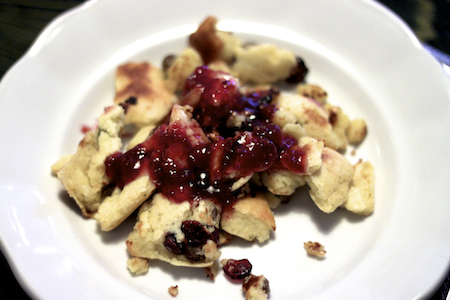 sneg previdno vmešaj v testo … segrej ponev, v njej stopi žličko masla, vanjo prelij testo in povrhu potresi oprane in osušene rozine in brusnice … ponev prestavi v pečico, ki naj bo ogreta na 200 stopinj …