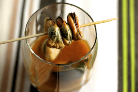 Planil sem po školjkah in sicer po spodnjem in po zgornjem cenovnem razredu. Spodaj so seveda črne, navadne dagnje/mušole/klapavice. Berasategui sugerira razpaljotko z najmanj 12 in največ 24-urnim mariniranjem že tradicionalno termično obdelanih školjk v mešanici njihovega lastnega džusa, belega vina, jabolčnega kisa, olivnega olja in navadnega ter pikantnega pimentona. Nimam nič proti – tole je super nadgradnja dolgočasnega in čisto navadnega paketa školjk.