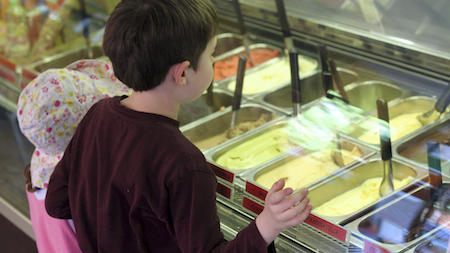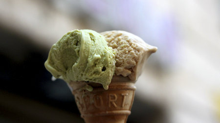 ko jo najdeš, se boš seveda začel spraševati, ali si našel obrat z dobrim sladoledom … evo finte: dobro si oglej banjico s pistacijevim sladoledom: je sladoled v njej živahno sijoče veselo zelen ali je zamolklo vojaškasto sivozelene barve? … no, če je živahno sijoče veselo zelen, je zanič – in z njim zelo verjetno vsi ostali sladoledi v radnji, saj so domnevno zelo kemičarsko plastični … barva pistacije tu spodaj levo je kar okej (v resnici je še bolj zamolkla, vsaj moj monitor je nakalibriran na vesele kolorje):