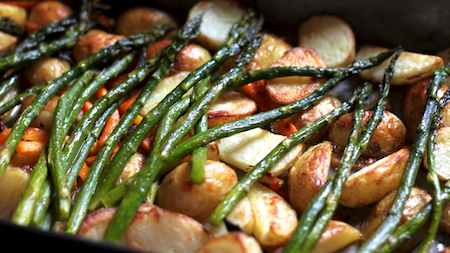 ta drobne nove krompirje cekneš na pol in jih prelijš z vodo, zavreš in pustiš brbotati pet minut, nakar jih odcediš in prestaviš v protfan … da ne bodo osamljeni jih zmešaj z nekaj na četrtinske palčke zrezanimi korenčki, par neolupljenimi stroki česna, na tanko narezanimi 2×2 cm koščki pancete in nekaj lističi žajblja … dodaj še sol in olivca, dobro premešaj in postavi v 200 stopinjsko pečico … po petnajstih minutah premešaj, dodaj šparglje in vrni v pečico … po še petnajstih minutah preveri, če je že in začni pripravljati solato, kozarce za dobro ohlajen sauvignon in soundsystem za soundtrack, ki je kombinacija barvitosti in začetka neke druge sezone: boye – fudbal