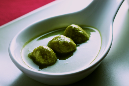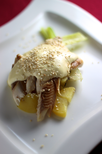 In sem na maslo djal krompir in peteršilj, prepražil, zalil z govejo juho in zmlel v nadvse dišečo in z lepim jasno izraženim okusom po peteršilju ozaljšano juho, ki so ji potreben duhovit twist in pikanten rob dodali cmočki iz masla, jajca, skute, jrena in drobtin. Pri enostavni in delovno zelo neintenzivni zloženki iz kuhanega krompirja (zgolj preprosto odišavljenega z rožmarinom in belim poprom), koromača (zgolj kuhanega), dimljene postrvi (zgolj preprosto sfiletirani in rahlo segreti v pečici) in tople majoneze, je bila glavna atrakcija prav slednja: zamešana iz jajca, hrena, gorčice, vermuta in toplega stopljenega masla je bila v ustih res svilnato bogata in prav vesel sem bil, da se mi je pri doziranju malo zatresla roka.