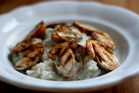 je namreč postavil zgroženo vprašanje: ja, oči! kaj si pa naredil s temi paradajzi?! … no, potem, ko so se na rezine narezani karželjni obojestransko pregreli na srednje vroči rebrasti ponvi in se zleknili na kepo kremaste rižote, so bili odpravljeni vsi pomisleki: