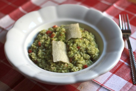 je čist ajnfoh: na olivcu brž-prž eno do finoče sesekljano šalotko … pa šalco riža … pa deci bevga, da huškne … pa vrel čikn fond po šeflcah dolivat in sporti rahlo solit … pa dva paradajzka dat iz kože (po 15 sekund v vreli in nato v mrzli vodi) in jim odstranit semena, kar ostane pa narezat na kockice … ko je riž na zob, vmešaš dve žlici pestota in paradajze … malo počakaš in okrencljaš s parmezanovimi ostružki …