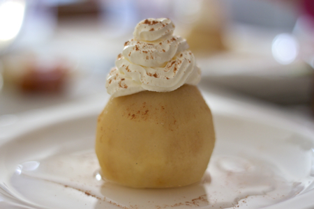 jabolka poberi iz sirupa in jih napolni z medorešno maso … ostalo smetano stepi in jo nabrizgaj za povrh … jabolko (zdaj mu že lahko rečeš tufahija) postavi v lužico sirupa na krožnik in posuj s cimetom v prahu … če ga boš postregel kakšnemu jobsistu, ga lahko na eni strani malo pajsneš stran …