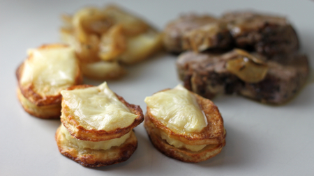 ko so krompirji že lepo porjaveli, jih potegni iz pečice in na vsakega drugega nažličkaj pire, preko katerega položiš drugo rezino krompirja, da dobiš sendvičke … na vsak sendviček pripopaj še rezino sira in postavi nazaj v peč, ki jo lahko pospešiš na 220 …