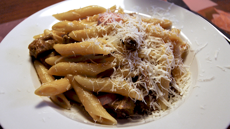 se pravi, da so mati pred odhodom na pot spohali štiri svinjsko dobre zrezke, ki smo jih hladne, v družbi m∂rzliga in restanga krompirja pojužinali, ko smo razpakirali … da se na smučiščih ne spakujemo po gorskih oštarijah, ampak v rukzaku nosimo za vsakega pe en sendvič s kajzerco, budžolo, sirom in kislo kumaro … da se popoldne špilajo družabne igre (pri katerih je vedno kdo tudi malo jezen) … da mora bit vsaj vsak drugi dan za fruštik hemendeks … da se večerja same zlate alspkoslovenske familijarne klasike: makaronflajš (obvezno s spremljavo rdeče pese in z makaroni, (raz)kuhanimi v minimalističnem old skul šugotu, kot je tale):