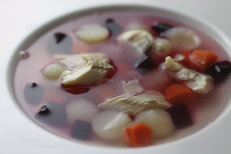 no, in potem je sledil še dodatni eksperiment – kako bi se pa v takile ruski župi obnesla še ena rusom ljuba zelenjava? … evo je, uha z rdečo peso: