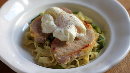 te šnite pa nato z obeh strani hrustljavo popečeš na srednje vroči ponvi in jih zadegaš čez kaj pomladnega … nimaš ideje? … evo ene: med široke nudle vmešaj na putru zdušene koleščke špargljev, preko pribij onole kvazikanadsko šunko, povrh pa poširan jajc: