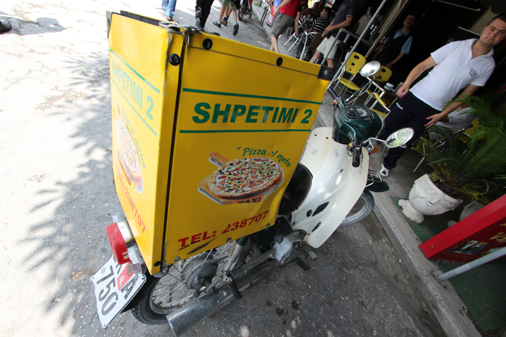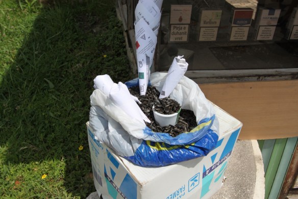 so se mi recimo prikazala ravno, ko sem si obrisal usta od v trikotnik zloženega nežnega sirovega bureka (ali byreka, kakor to zapišejo aboridžini) in je bilo že treba jemati pot pod noge … kar je še kar škoda, glede na to, da so verjetno vse albanske kure (in goske in purani in race in govedo) free-range, saj jih neprestano vidiš na paši, kamorkoli že greš … aja, da ne pozabim … če v sebi začutiš klic ikarusa, se lahko pred skokom s kakšne pečine okrepčaš s sjemenkami, ki jih držijo za vsako trafiko: