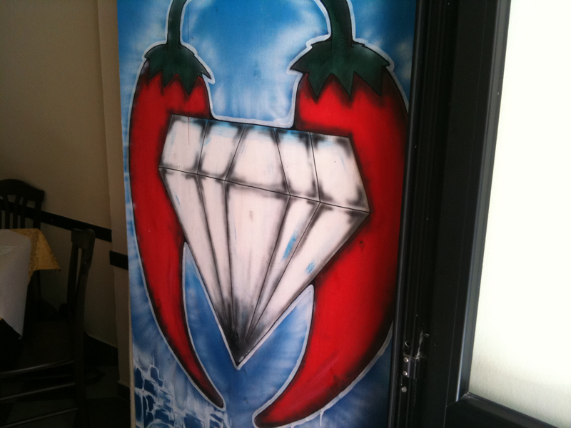 kul, ane: hrvatje imajo seve nazionale, diamantarji pa sede nazionale … in to ene jako pomembne organizacije, kar postane jasno po ogledu njihovega spletnega doma (morebitne fene ljute papričice opozarjam, da bo letošnji festival peperončina v diamanteju potekal od 7. do 11. septembra ) … in tako je bilo kaj kmalu jasno, da v tem mestecu ne bomo prošli samo z žganjem z neba, ampak da bo žgalo tudi v žnablu … in je! … na kvazi glavni notranji uličici smo namreč nabasali na tale mural,