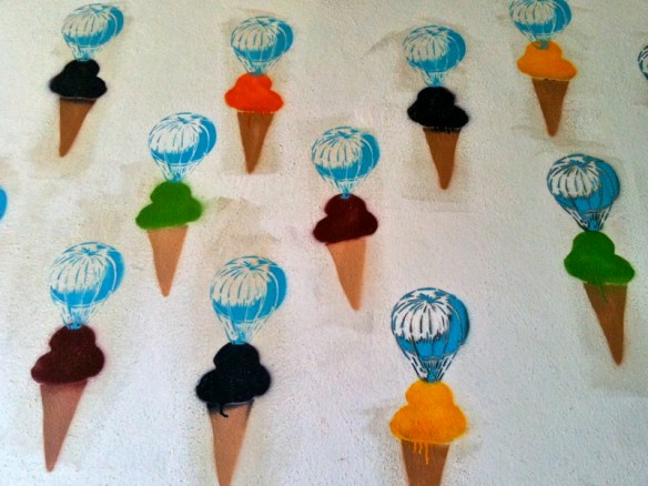 kljub temu, da je posnetek relativno kratek, naj povem, da sem se ob njem ponovno spomnil na oni znani citat jeroma klapke jeroma, češ, nobena druga stvar na svetu me ne prevzame tako, kot delo: cele ure lahko sedim in ga opazujem … to bi počel tudi jaz, a se je bilo treba najprej it malo metat v valove, obenem pa odkrivat naslednjo diamantsko znamenitost, murale … murali so take poslikane fasade in v diamanteju ljudje že od leta 1981 radi sprejemajo umetnike, ki bi radi kaj naflajsali na njihove zidine … pri tem seveda niso izvzeti niti prehranski motivi … zaradi vročine (no, pa tudi zaradi mojih simpatij do stenciliranja) vam najprej posredujem tale všečen sladoledni kompletek: