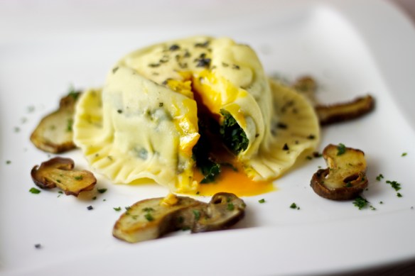 Reč izgleda (in tudi je) super, a pri pripravi je treba vseeno biti previden, saj možni zoprni zajebki prežijo nate tako rekoč pri vsakem koraku priprave. Še najbolj preprosto je testo – klasično razmerje enega jajca na 100 gramov moke lahko podebljaš s kakšnim rumenjakom, mesiš vsaj četrt ure, zaviješ in pustiš počivat dobro uro. Medtem se loti špinače: za vsak raviol je boš potreboval vsaj četrt kile (res!): poreži ji stebla, jo operi, posoli, popopraj, dodaj strok česna, premešaj in butni v razgreto kastrolo (brez olja, brez vode), pokrij in počakaj približno dve minuti, da se zmehča. Odcedi, počakaj, da se ohladi in jo dobro (res, orng) ožmi in sesekljaj (na roke, ne s paličnim ali mikserjem). Špinačo kar korajžno potresi z ribanim parmezanom, nato pa v kozici stopi po žlico masla za vsak raviol in segrevaj, da postane svetlo rjave barve. Prelij po špinači, dobro premašaj, nato pa z mešanico natlači valjaste kozarce in za nekaj ur postavi v hladilnik, da se strdi. Spoširaj jaca: zavri dva litra vode, dodaj dve žlici kisa in iz majhne skledice v vodo previdno zvrni jajce. Zmanjšaj ogenj na minimum in poširaj tri minute, nato pa jajce prestavi v mrzlo vodo. Za finalno sestavljanko pa tako: razvaljaj testo za raviole in odreži dva tipa kvadratov: velike in še večje. Na velikega položi iz kozarca izbezano špinačo, na gornji strani s prsti naredi vdolbino za poširano jajce, nato pa prek vsega previdno položi večji kvadrat, ob straneh iztisni zrak, na dnu pa dobro stisni skupaj in izreži lepo okroglo dno. Raviol kuhaj pet minut in ga postrezi z na maslu popečenimi jurčki. Špinača bo lepo segreta in aromatična, rumenjak bo dodal svilnato bogato sočnost …