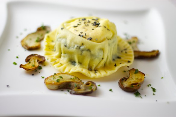 Za domače kuhinjsko krivljenje Blancove kuharije pa si nisem mogel kaj, da ne bi bil poskusil scimprati kompleksnega ogromnega raviola, polnjenega s špinačo in poširanim jajcem.
