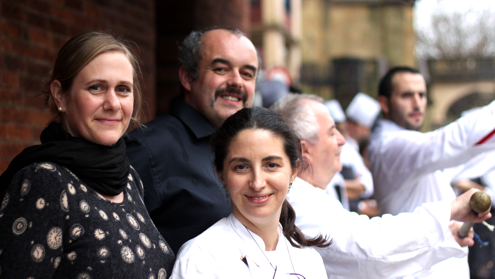 spodobi se in pravično je, dragi bralec in bralka, da reportažne zapise o potikanju po sansebastjasnkih gastro kotičkih, končamo v sami špici kuharskega brbotanja v tej ne le baskovski ali španski, ampak kar evropski, če že ne svetovni njamzi meki … arzak je ena od treh z najvišjo dozo michelinovk opremljenih sansebastianskih restavracij … malo posebna je zato, ker je bil juan mari arzak – ata, ki jih bo letos dopolnil sedemdeset – tisti, ki je prvi v baskiji začel uvajati in prakticirati trende sodobne kulinarike in lokalno, preprosto košto nadgrajevati v spektakelske umetnosti svetskega kova in je tudi prvi začel nabirati zvezdovje … restavracijo trenutno skupaj vodita juan mari in njegova hčerka elena in zdi se, da je prav ta družinska vez tisto, kar celotni predstavi, ki so je deležni gostje, daje posebno prijeten, sproščen, domač občutek … vodenje namreč poteka tako, da hrano pripravlja za en orng razred kuharjev (trideset jih je), juan mari in elena pa medtem – včasih eden, včasih drugi, včasih pa oba – nevsiljivo, a opazno, minglata med gosti … še posebej je fleten stari arzak, ki svoje stare znance vneto treplja po ramenih in kušuje na pleše, k kakšni znani družbici pa tudi prisede in z njo spije kupico ali dve … mogoče je tako sproščeno vzdušje vladalo zato, ker je bil ravno sv. boštjana dan, ko so, kar bralec in bralka že vesta, sansebastiančani v nekem paralelnem skulirano praznovalem svetu … da je tamborrada čez vse, se je pokazalo, ko se je tam nekje pri sladicah zaslišalo bobnanje in trobljenje, nakar se nas je ker nekaj iz jedilnice napotilo ven, kjer smo že lahko videli prave arzakove kuharje ki gledajo našemljene tamborradske kuharje, ti pa nažigajo svoje komade pod dirigentskim vodstvom – le kako bi lahko bilo drugače – hodo dobrovoljnega juana marija arzaka … paparaci so na veselem dogodku ujeli tudi nekatere slovenske obraze (v družbi elene arzak):