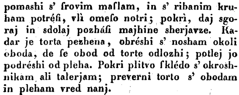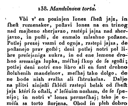 receptu nikakor ne bi pripisal 213 let – je namreč še dandanes tako, da se v marsikaterem stajliš establišmentu radi pohvalijo, da imajo na jedilniku tortico brez moke … no, eto, kaj je pa to tacga, vodnik jo je že zdavnaj pogruntal: jajca, mandlji, cukr (rjavega daj!), malo parfuma (limonova lupinica, mogoče cimet) in tojto! … starci vejo!