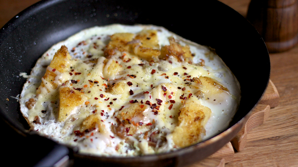 bela omleta je v bistvu kot navadna omleta, le da je brez rumenjakov – ponavadi so že beljaki sami ostanki kakšnega majonezenja ali nudlanja … no, in ta belina nato služi kot vezivo razne robe, ki jo daješ v ponev … konkretni primerek je začel nastajati s hrustljavim zapekanjem polente na srednje segreti ponvi … nato je na sceno uletelo še malo čebule in ocvirkov (kurjih, jasno), nakar je že bil čas za beljake, nato pa še za nariban kos janijevega čadrškega sira, zmanjševanje ognja in pokrivanje ponve s pokrovom … ko je sir šmelcnil je bil čas še za finalni move: solpopr in flekce diamantskega peperončina … pol pa na sneg …