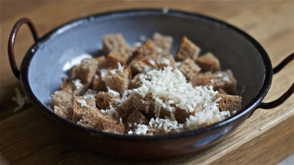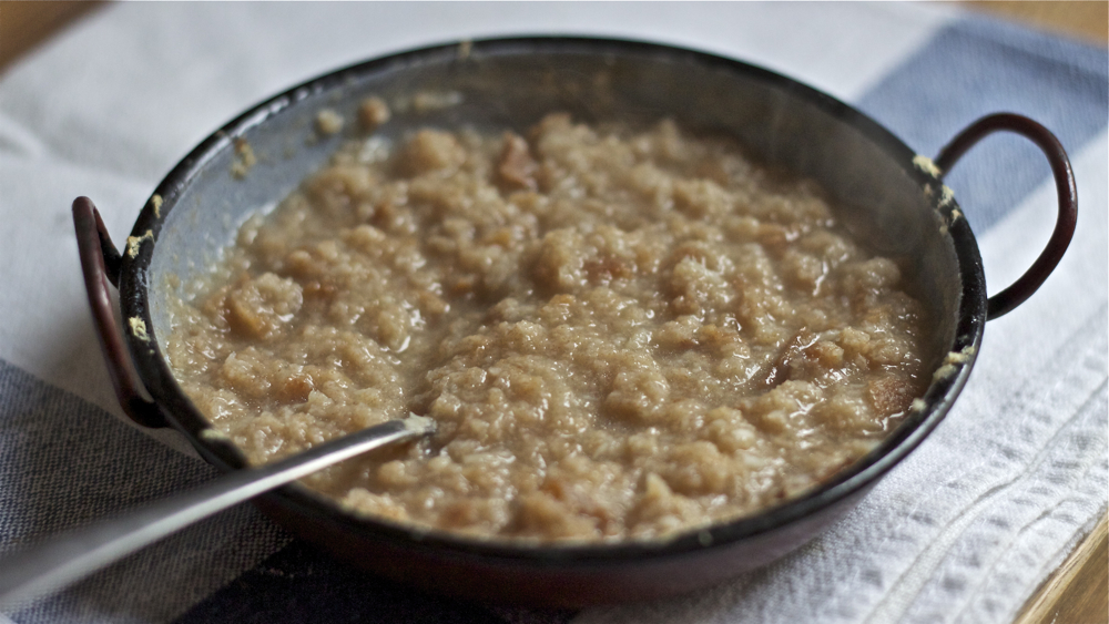 količine prilagajaj svojim preferencam, postopaš pa tako, da kruh in hren preliješ z vrelo govejo juho, postaviš na ogenj in mešaš, dokler kruh ne razpade in se vse skupaj ne spremni v nekakšno relativno poenoteno kašasto zmes: